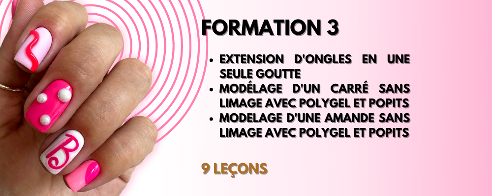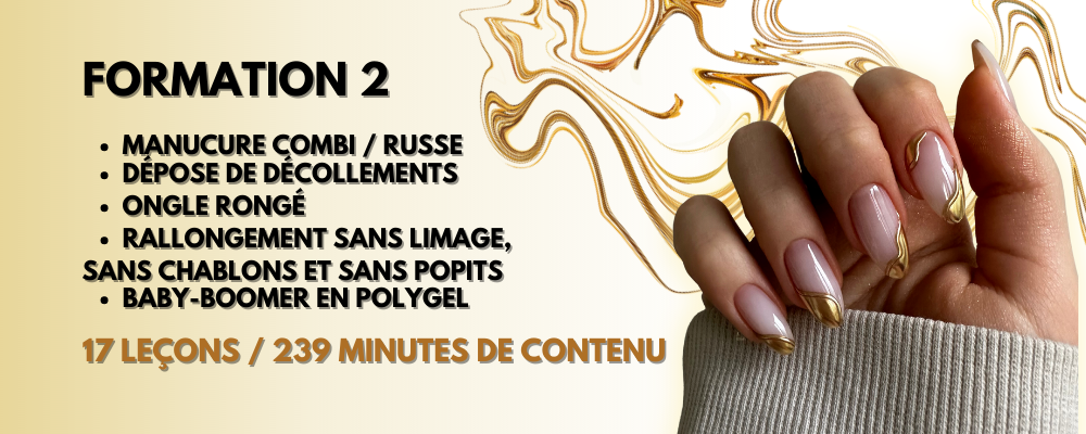 4. Quatrième sujet - Baby-boomer en construction avec du polygel. Souvent, les prothésistes ongulaires recherchent la formation baby-boomer, dans notre leçon, vous apprendrez cette technique en 15 minutes de vidéo, avec des explications claires et structurées pour la réaliser facilement.