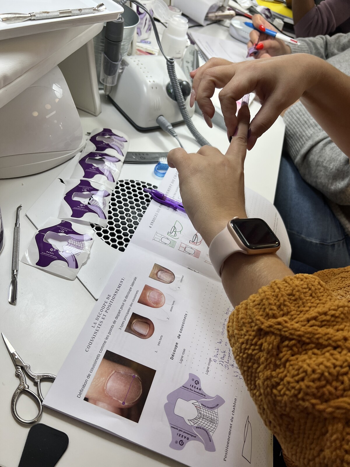 Préparation théorique en ligne (regardez à votre rythme les leçons sur la stérilisation, la sécurité du styliste ongulaire et des clients, les maladies, la chimie des matériaux, les outils, et les exercices basiques pour preparer la main aux gestes just pour faciliter l'aprentissage).
